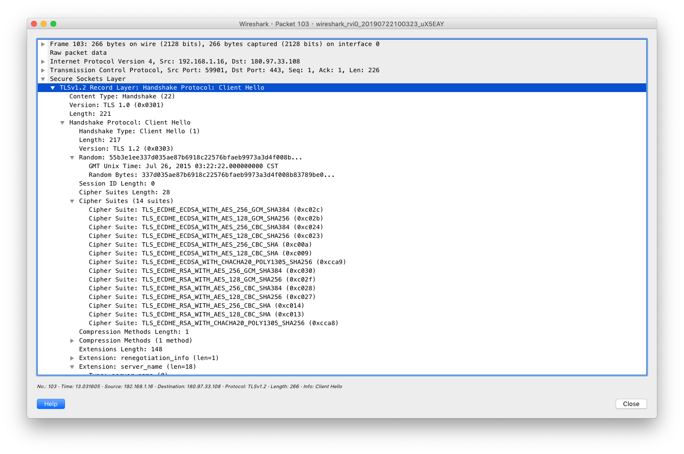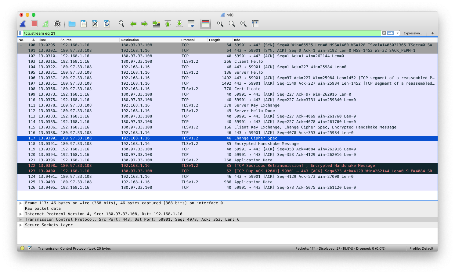 首先我们看到TCP的三次握手,然后是SSL/TLS的握手流程: