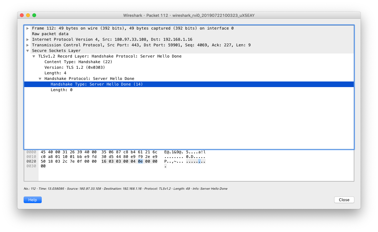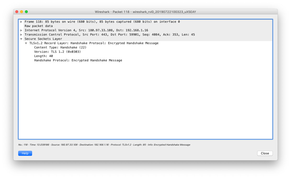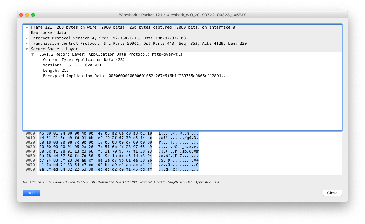 该报文就是实际的HTTP报文内容,已经被主秘钥加密;另外可以看到该报文不属于握手协议,而是Application_data_protocol http-over-tls
