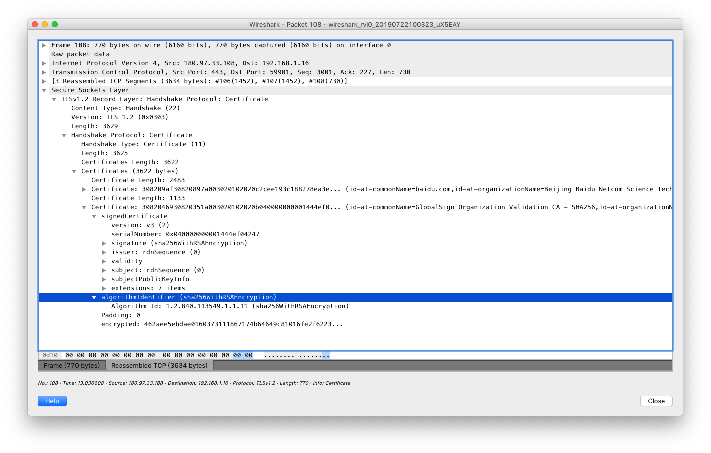 baidu这里采用的是ECDHE算法,主要包括椭圆曲线类型和公钥,用于主秘钥的计算;这里数字证书中的秘钥就不参与主秘钥的协商了