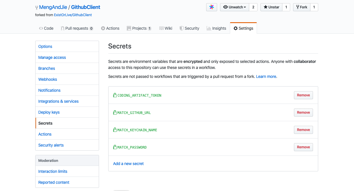- 在workflow中可能会使用token,secret-key这样的私密信息,无法明文写在配置文件中。 这些信息可以在repository的setting配置为secret,然后在step中配置为env